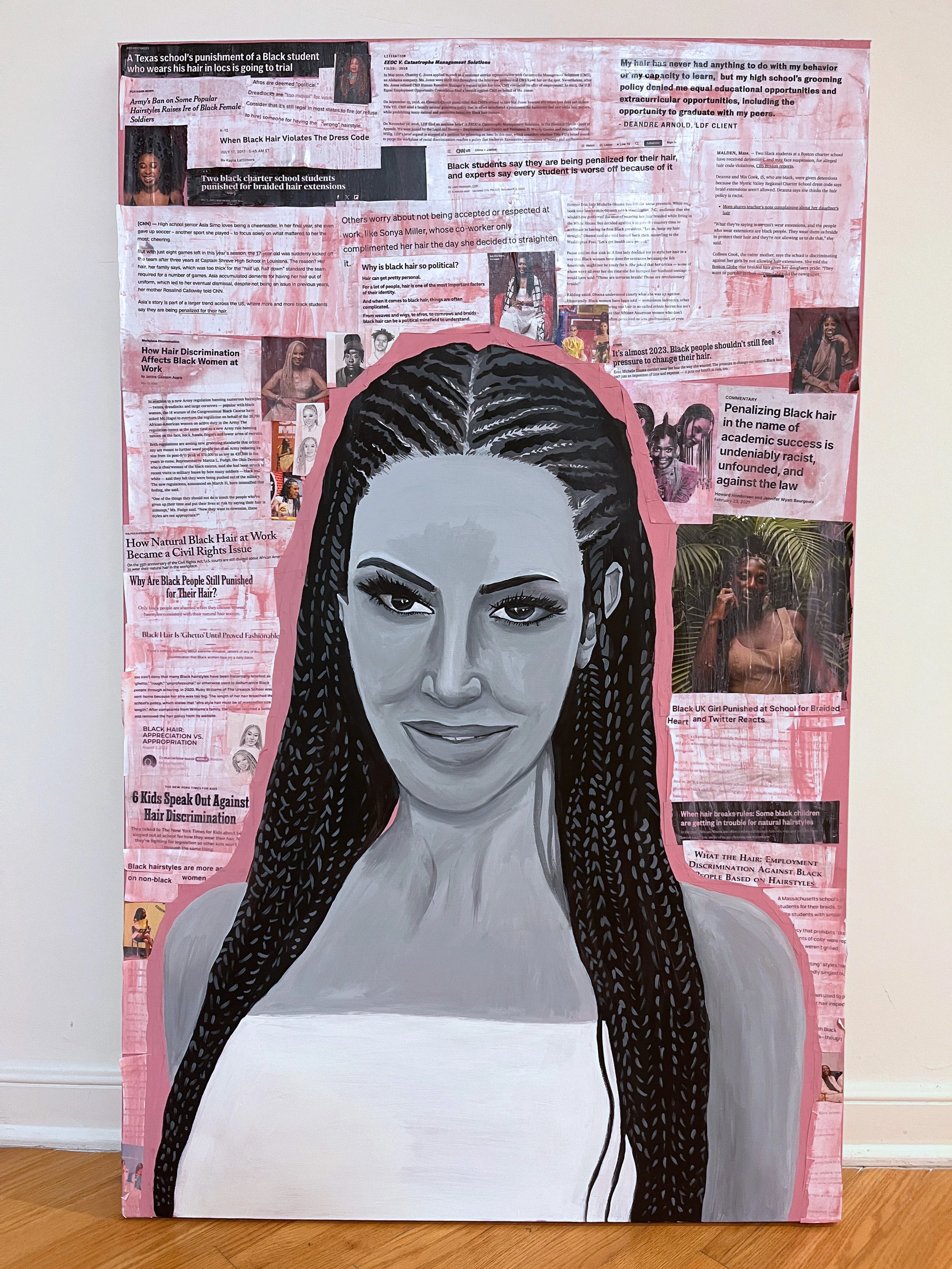 During my free time, I often like to paint celebrities. The Kim Kardashian piece, Borrowed Brilliance, highlights the cultural appropriation paradox - inviting viewers to reflect on the persistent unfair biases, urging a balanced, thoughtful approach to cross-cultural influence without erasure or harm.