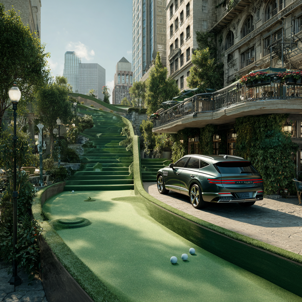 Life imitates golf. Spotting the game everywhere. This series reimagines unexpected terrains—like subway stairwells or city streets—as striking golf holes, with Genesis vehicles as elegant disruptors that merge design, performance, and innovation. The visuals can also serve as interactive online vehicle displays.